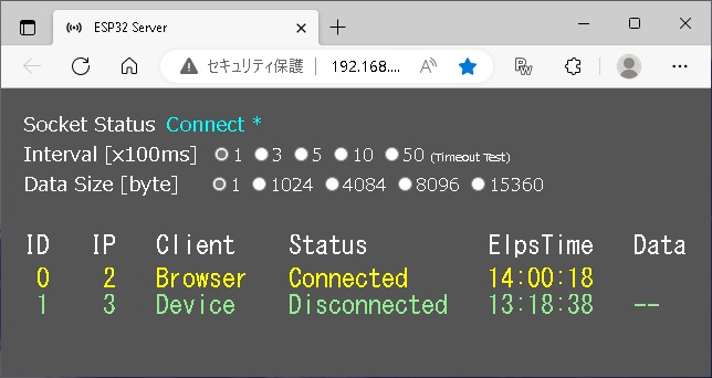 本実験のため、クライアントの連続接続時間(秒単位)を測定する処理をアクセスポイントに組み込んでいた。上記は、その実験結果の画面コピーである。インターバル100msecで13時間18分、インターバル1000msecで20時間56分となった。