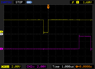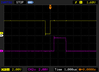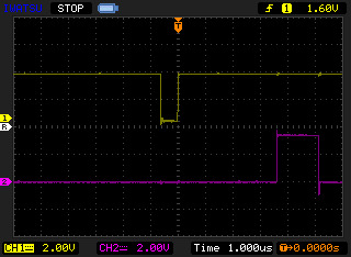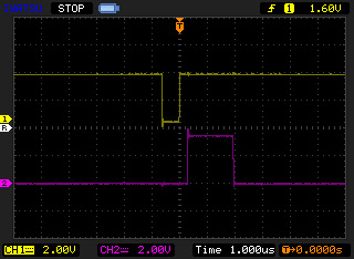 オシロスコープ上段(黄色)が発生パルス、下段(紫)が検出ピンの信号。幅608nsecのパルスを発生させ、検出フラグ確認後に検出ピンをHIGHとし、休止関数 sleep_us(1) を呼び出してからLOWとしている(実際には2usec近く休止)。下記の括弧内の数値は、パルスHIGHエッジから検出HIGHエッジまでの時間である。